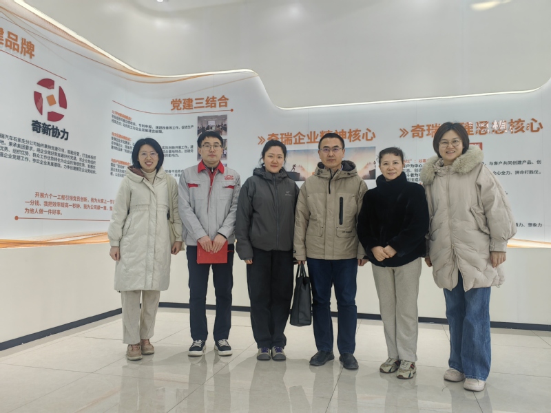 在奇瑞新能源石家庄分公司,公司人事部经理徐晓详细介绍奇瑞集团校园招聘用人需求和不同岗位的人才培养模式,带领调研组参观公司文化展厅,了解奇瑞集团党建工作品牌。贾鹏介绍了山东农业大学丰富的专业设置和毕业生求职意向,双方就校企合作、进校宣讲、文化建设等方面的合作达成共识。