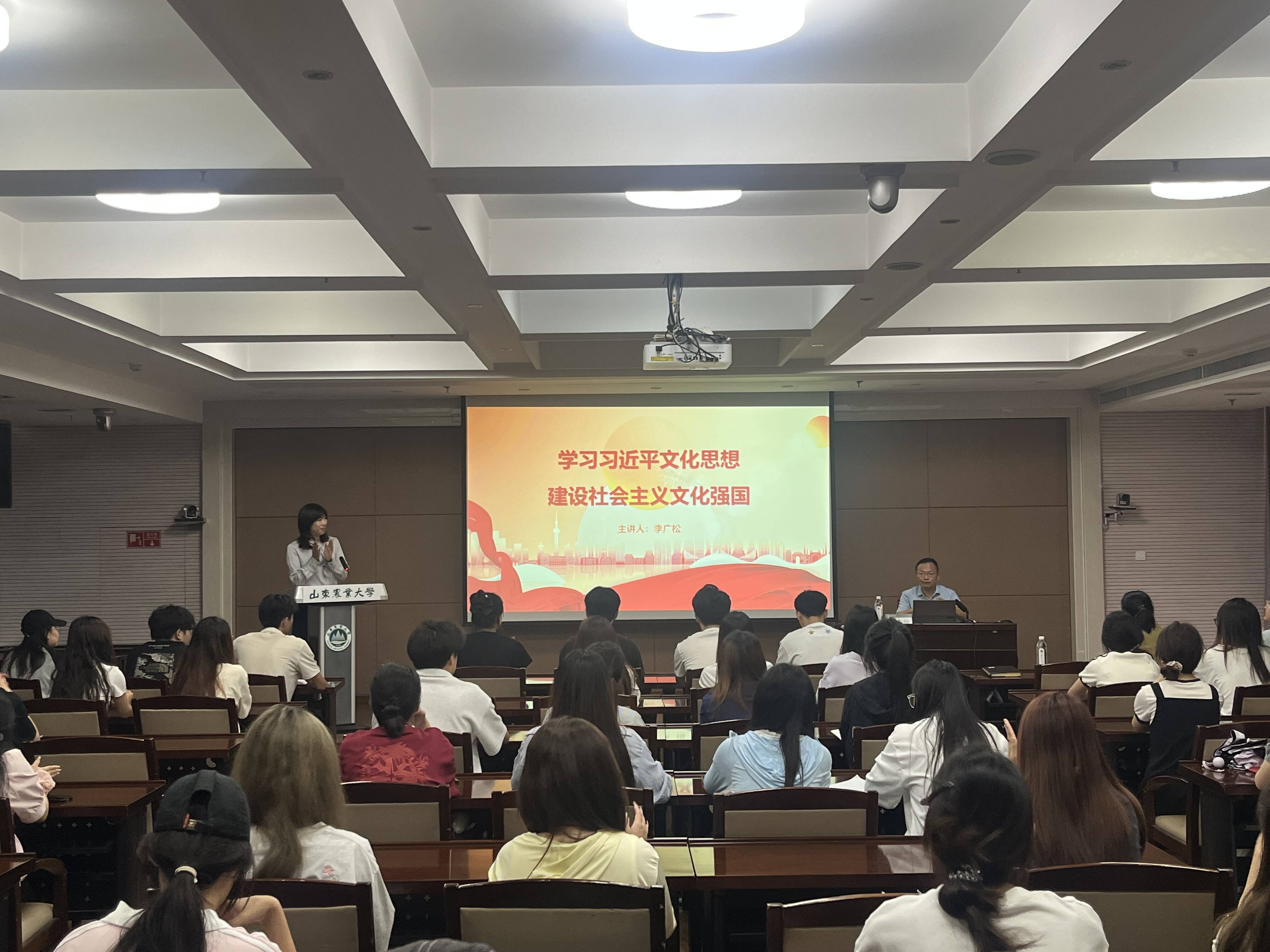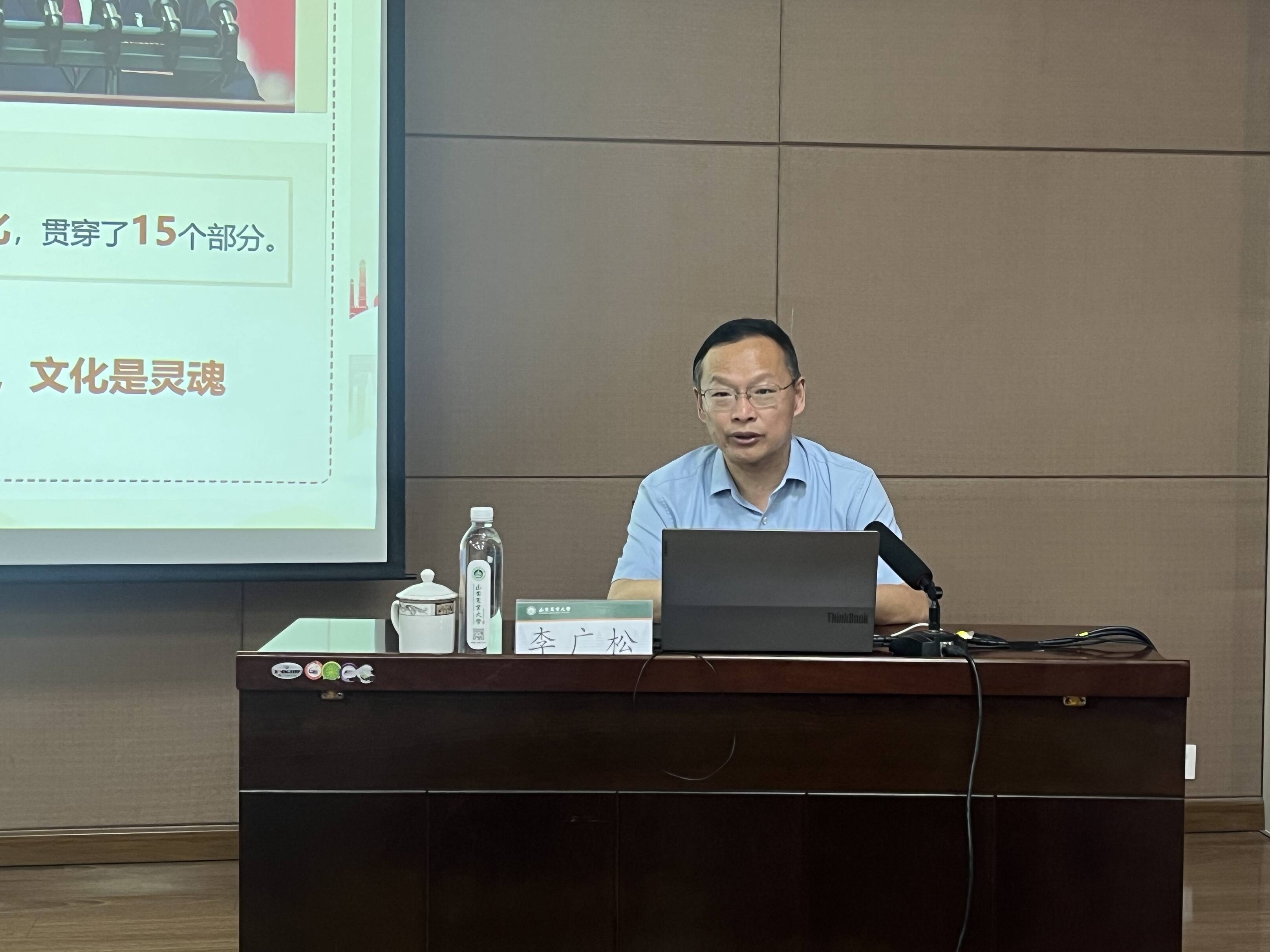 6月25日上午,学校党委常委、副校长李广松以《学习习近平文化思想 建设社会主义文化强国》为主题,为艺术学院党员和入党积极分子讲授了一堂深刻而生动的思政课。